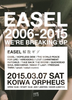 ~EASEL LAST GIG~ w/ EASEL / HOPELESS DEW / RATCHILD FOR LIFE / TAKE BACK THE BEERS! LOST COMMITMENT / SOUL DISCHARGE THE WORLD PEACE / 16REASONS THRH / smell / neko! OPEN 16:00 / START 16:30 ADV ¥1,800 / DOOR ¥2,000